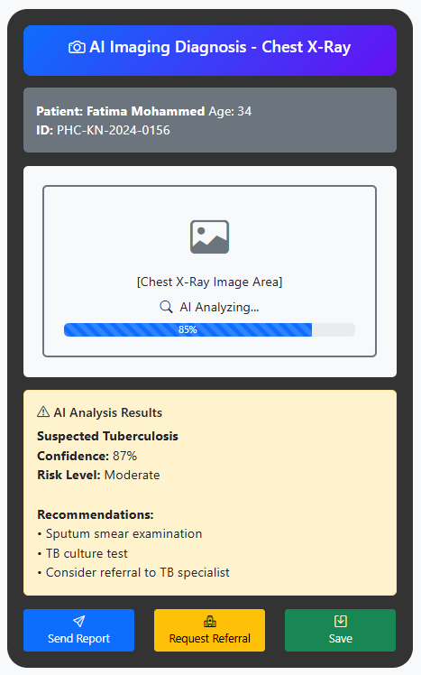 - Instant Diagnostic Support: A nurse uploads a chest X-ray via tablet; the AI provides a TB diagnosis suggestion and referral recommendation in seconds.